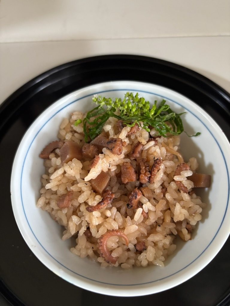 たこ飯の素を汁ごといれて炊くだけ大葉を乗せてどうぞ