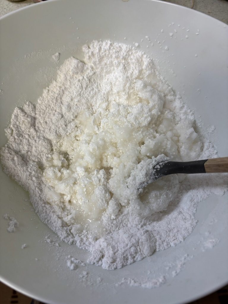 米粉に砂糖と熱湯を注ぎ、耳たぶぐらいの柔らかさまでこねます